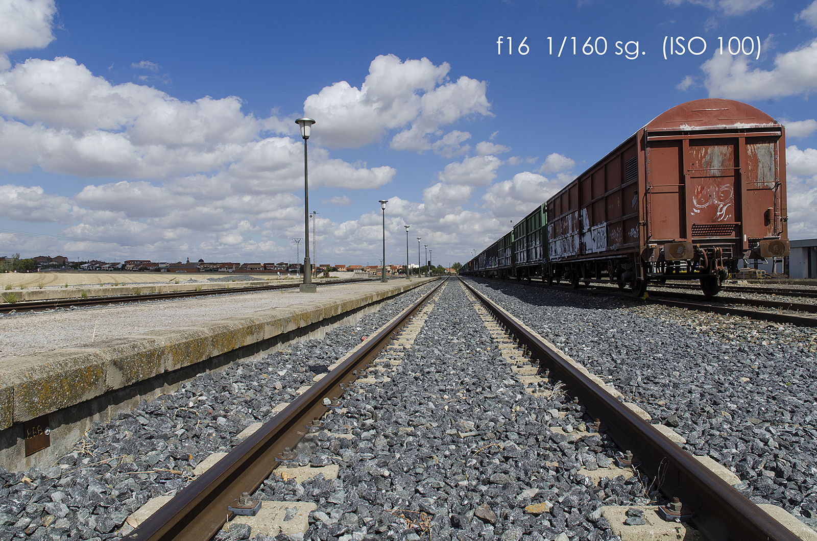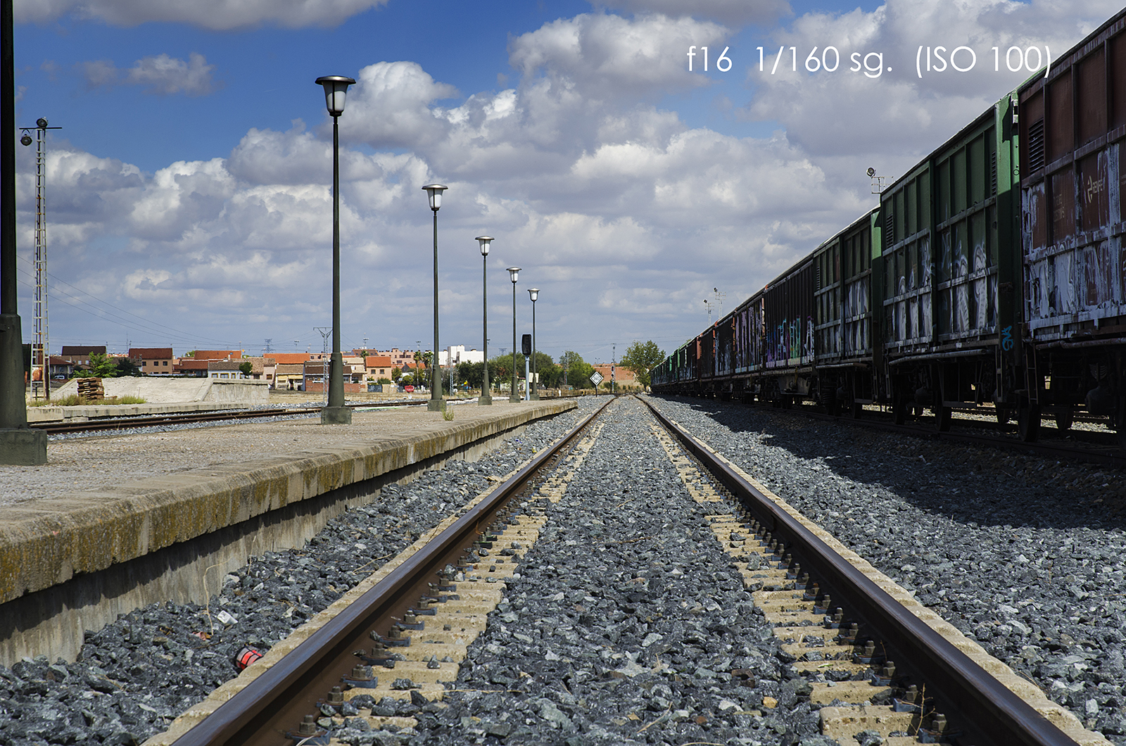 - Otro, y quizá el más abstracto de entender, es que, según la distancia focal empleada, el efecto óptico que se produce, al variar el ángulo de visión (ángulo de visión más abierto para una focal corta y más cerrado para una focal larga), hace que parezca que los planos de la imagen en la dirección que definen la profundidad en el espacio, tiendan a comprimirse (distancia focal larga) o expandirse (distancia focal corta). A medida que aumentamos el valor de la distancia focal, se pierde la noción de la distancia relativa que los objetos tienen entre sí. En las tomas que sirven de ejemplo, si se miran las dos extremas (18 mm y 210 mm), se puede apreciar, más claramente, lo descrito: En la de 18 mm, la distancia entre las farolas se aprecia que es mayor que la que se percibe en la de 210 mm; así mismo, por ejemplo, las nubes, que a una focal corta aparecen como bloques independientes, con una focal larga (98 mm.) se ven como una masa compacta.