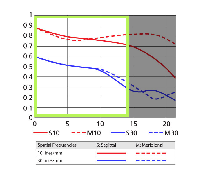 Este objetivo está diseñado para full frame. Sabemos que podemos usar objetivos, normalmente, diseñados para full frame en cuerpos con sensores APS-C, como es mi caso. Y seguramente habrás oído que el rendimiento es mejor; bueno, ya puedes intuir el motivo (el diámetro de la lente cubre por entero el tamaño del sensor, por lo que el tercio central del objetivo, que es el de mayor rendimiento óptico, cubre la mayor parte de la superficie del sensor). Fijémonos, por tanto, en el comportamiento del 50mm en un cuerpo APS-C.; para ello, cogeríamos una gráfica correspondiente a la de la lente full frame, de la cual solo tendríamos en cuenta, para su análisis, los valores hasta 14.16mm (zona resaltada en verde).