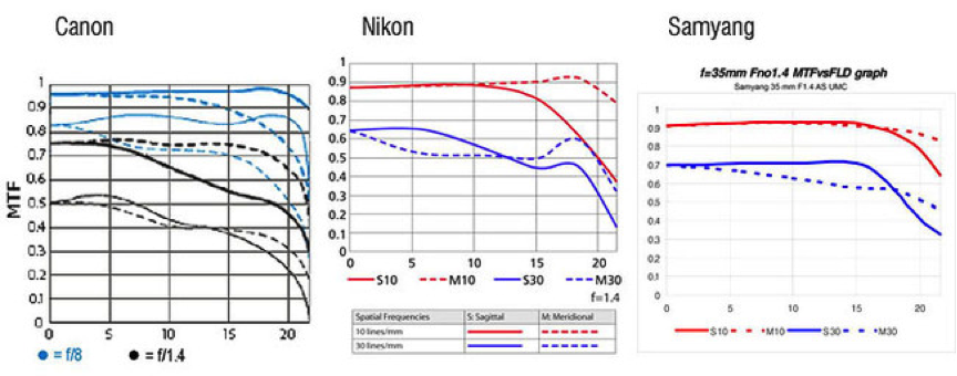 Si no se especifica apertura alguna, entonces la gráfica se refiere siempre al rendimiento en la máxima apertura del objetivo en cuestión. Una apertura muy habitual en los test que podemos encontrar por internet es f/8, esto se hace como referencia pues suele ser donde muchos objetivos ‘suelen’ encontrar su punto dulce o máximo rendimiento. Ahora ya podéis leer esta gráfica tomada de una comparación entre 3 objetivos de Canon, Nikon y Samyang en el foro de DPreview ¿os atrevéis? (en la de Canon, fijaros que tenemos dos aperturas f/1,4 y f/8 como os comentaba)