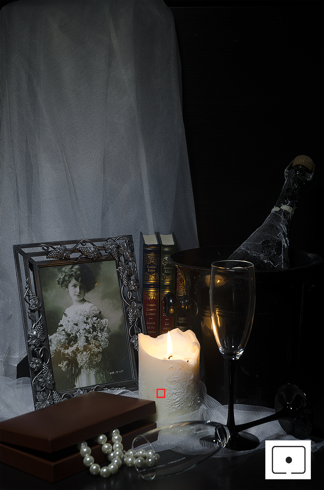 En este caso, como se aprecia en la lectura directa arrojada, durante el testeo, por el programa de revelado (zonas azules y rojas); para haber sido medidas todas las partes de la escena, y ser una imagen muy contrastada, el resultado es bastante aceptable; ya que, tanto en las zonas de sombras máximas como en las de altas luces, la información que tenemos perdida porque quede empastada, saturada o quemada, respectivamente, es muy poca (y la de la vela, casi evidente e inevitable); y el resto de las partes de la escena, correctamente expuesta.