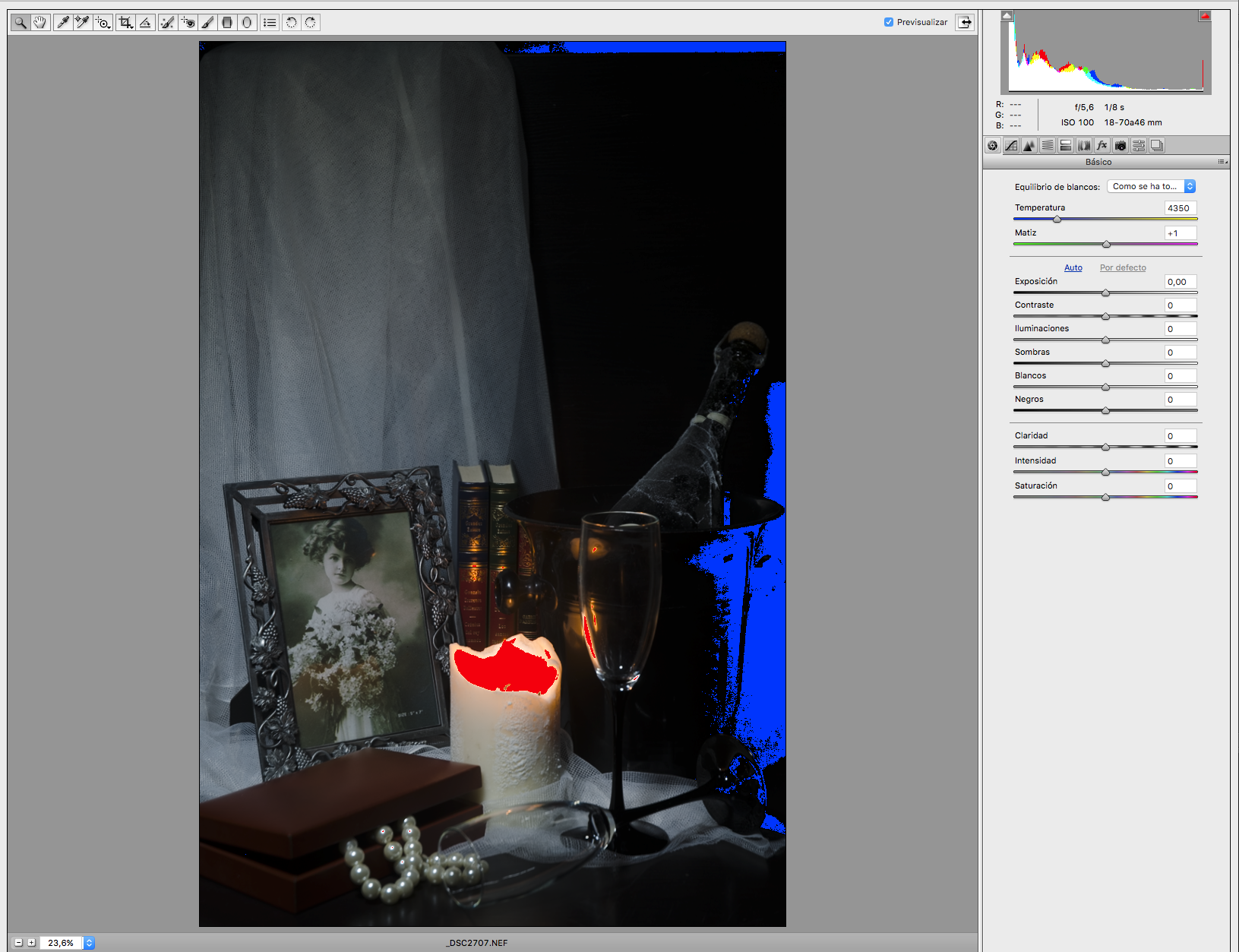 Para este caso concreto, y en las condiciones en las que se ha realizado la medición (medición sobre la vela – blanca -) este hubiera sido el modo menos aconsejable, ya que al realizar la medición sobre un punto con tonalidad blanca, la cámara ha interpretado que la escena podía estar sobreexpuesta, con lo que ha recalculado la medición para compensar lo que ella creía como exceso de exposición, con lo que la toma resultante presenta un cierto grado de subexposición. Como puede apereciarse en la zona coloreada de azul de la captura del programa de revelado. Además de que el conjunto global de la escena queda más subexpuesta que en los ejemplos anteriores con los otros dos modos de medición.